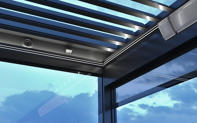 Unsere bioklimatischen Pergolen bieten Ihnen vielfältige Beleuchtungsoptionen. So schaffen Sie die richtige Stimmung für ein Abendessen oder die gemütlichen Momente des Abends.